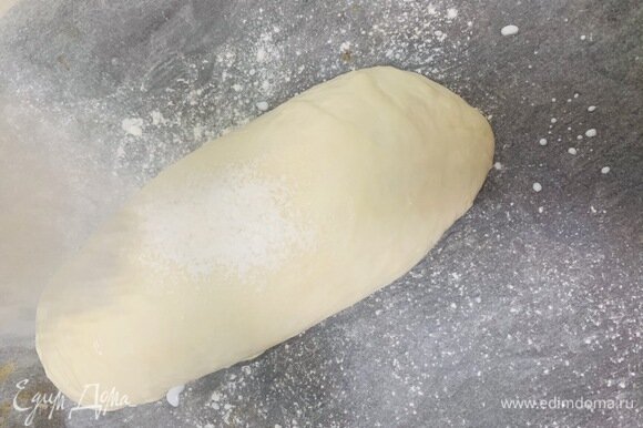 Шаг 8. Через полчаса слегка присыпьте стол мукой. Аккуратно, без сильного обминания, выложите на него подошедшее тесто и растяните руками в прямоугольный пласт.