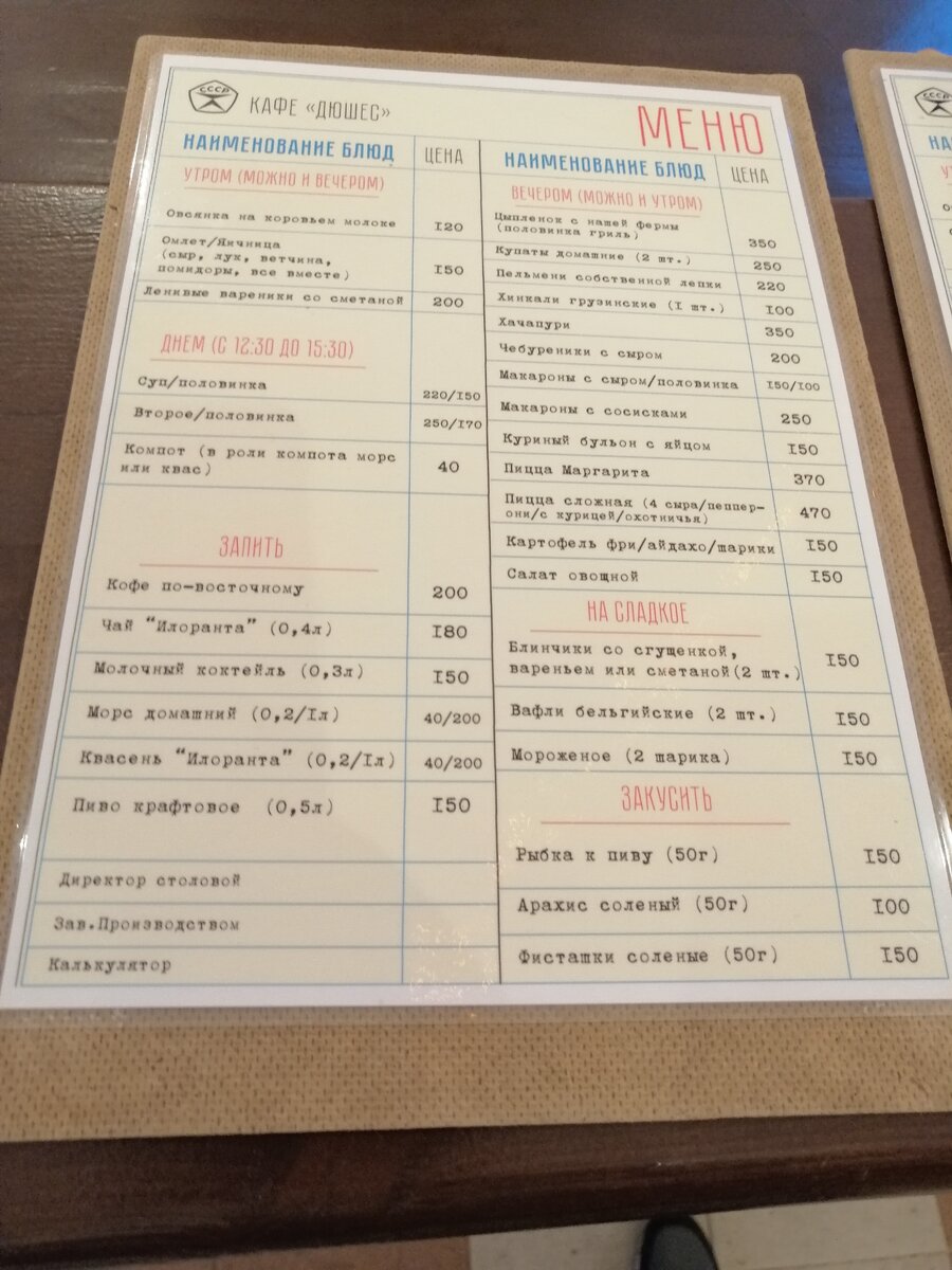 Полное меню — это настоящая гастрономическая экскурсия. Здесь и классика советской кухни: ленивые вареники, пельмени и тот самый, лучший в мире, компот из сухофруктов. Не забыли и о блюдах народов СССР: хинкали, чебуреки, купаты.