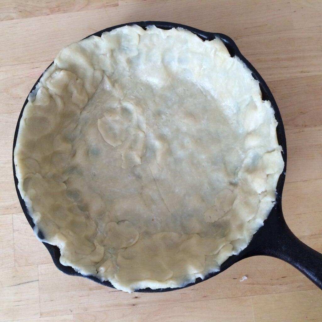 Тесто раскатать в пласт толщиной 0.5 см, перенести с помощью скалки в форму, смазанную маслом и присыпанными сухарями, сделать бортик примерно 5 см. Лишнее тесто надо убрать.