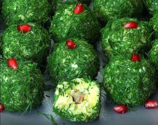 - Из охлажденной массы сформируйте небольшие шарики. Мелко порубите укроп и обваляйте в нем каждый шарик. Для праздничного вида украсьте шарики зернами граната.