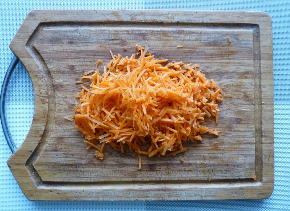 Шаг 3: Подготовка моркови. Морковь очистите и натрите на крупной терке.