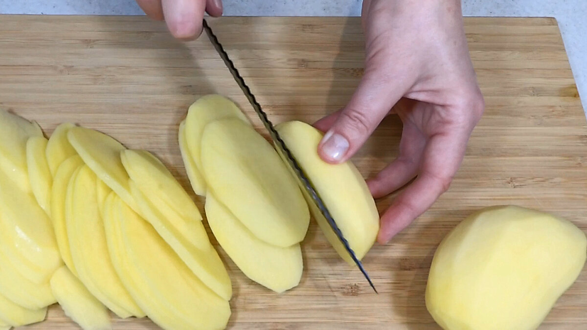 Начнём с картофеля. Его нужно нарезать довольно толстыми кружочками и поместить в кастрюлю.