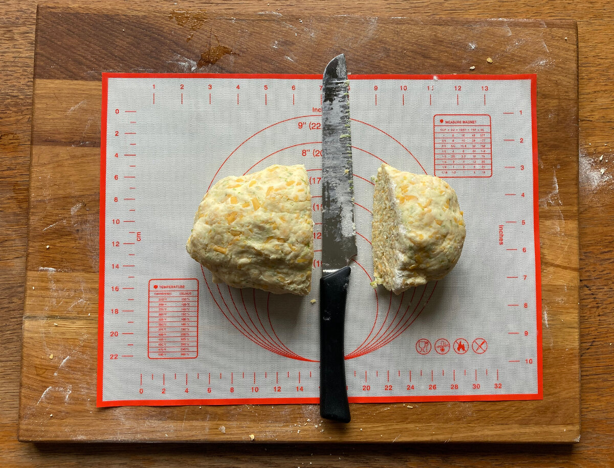 Влейте цитрусовую воду в сухую смесь и быстро замесите тесто. Сначала используйте лопатку или вилку, чтобы не нагревать массу руками. В конце можно слегка помочь руками, собрав тесто в ком. Оно должно быть мягким, пластичным, но не однородным — наличие масляных и сырных вкраплений совершенно нормально.
