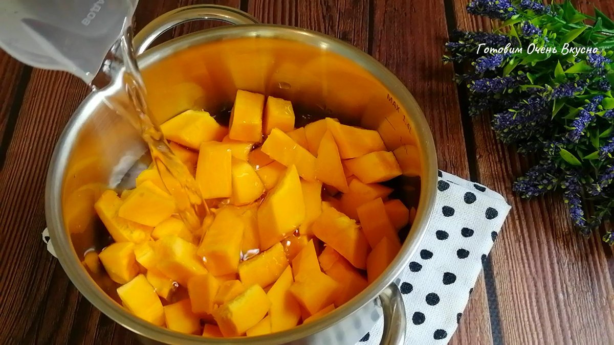 1. Тыкву очистить, нарезать кубиками. Залейте холодной водой и доведите до кипения.