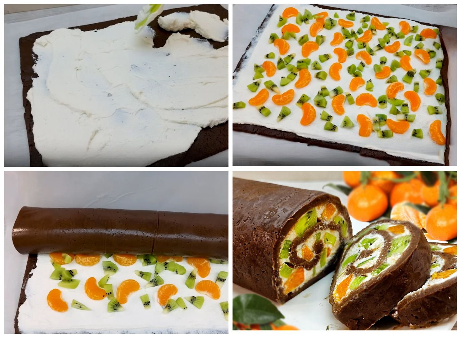 Нежный шоколадно-фруктовый торт в виде рулета понравится всем без исключения сладкоежкам.