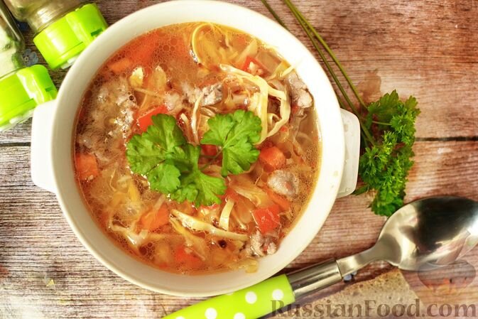 Этот суп — находка для тех, кто хочет приготовить первое блюдо, но не имеет времени на долгую варку бульона. Его основа — тушёная с помидорами капуста и мясной фарш. Получается густой, наваристый и очень ароматный суп, который больше напоминает рагу.